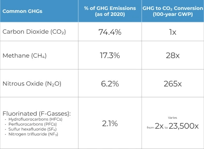 If you see “CO₂e” rather than CO₂, don’t panic. It just means CO₂ “equivalent”. CO₂e provides a common unit to measure global warming regardless of the different gas types involved. A metric ton of any other greenhouse gas can be easily converted into 'equivalent' tons of CO₂ using its respective Global Warming Potential (GWP). CO₂e simplifies top-level reporting. (see chart the below).